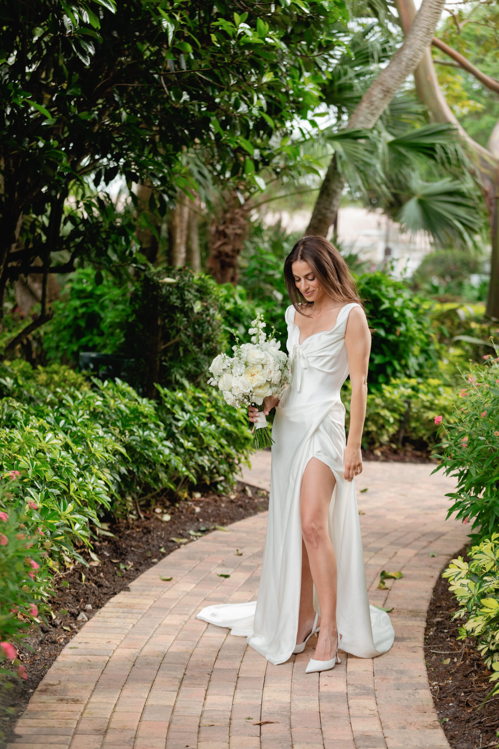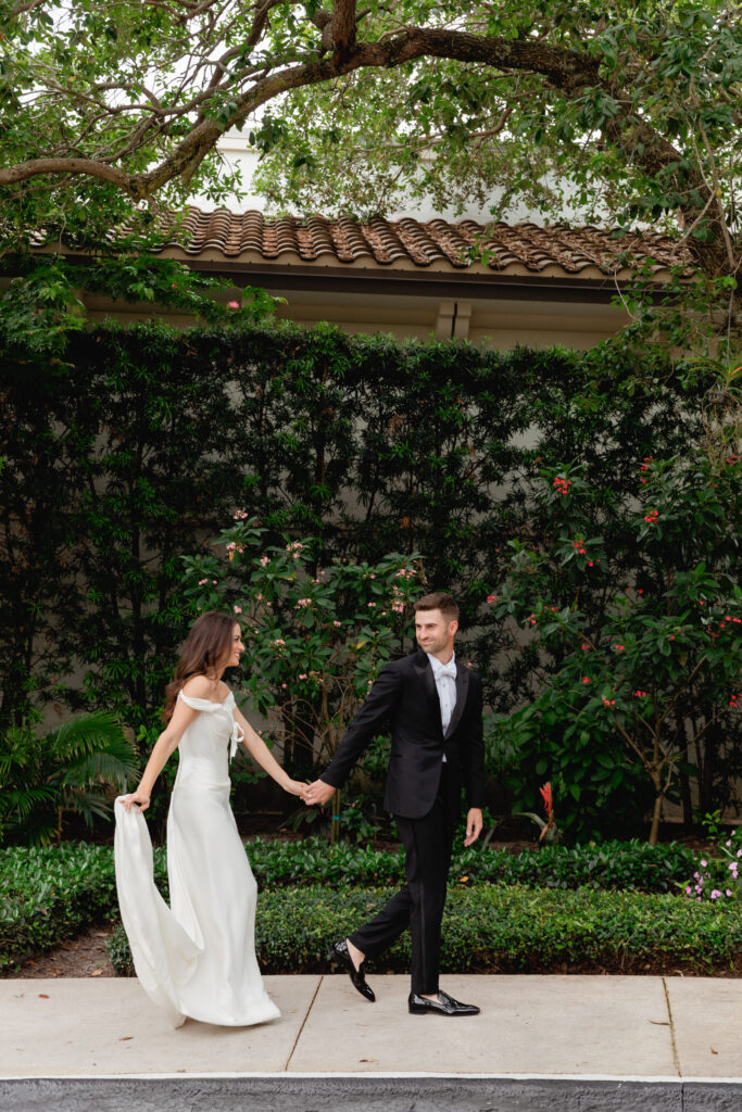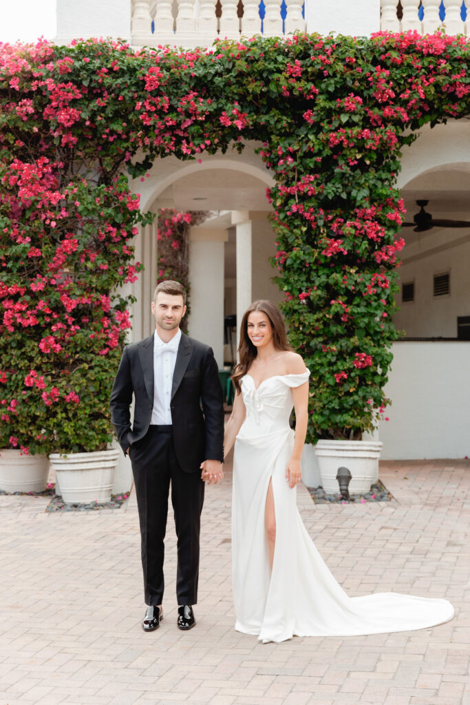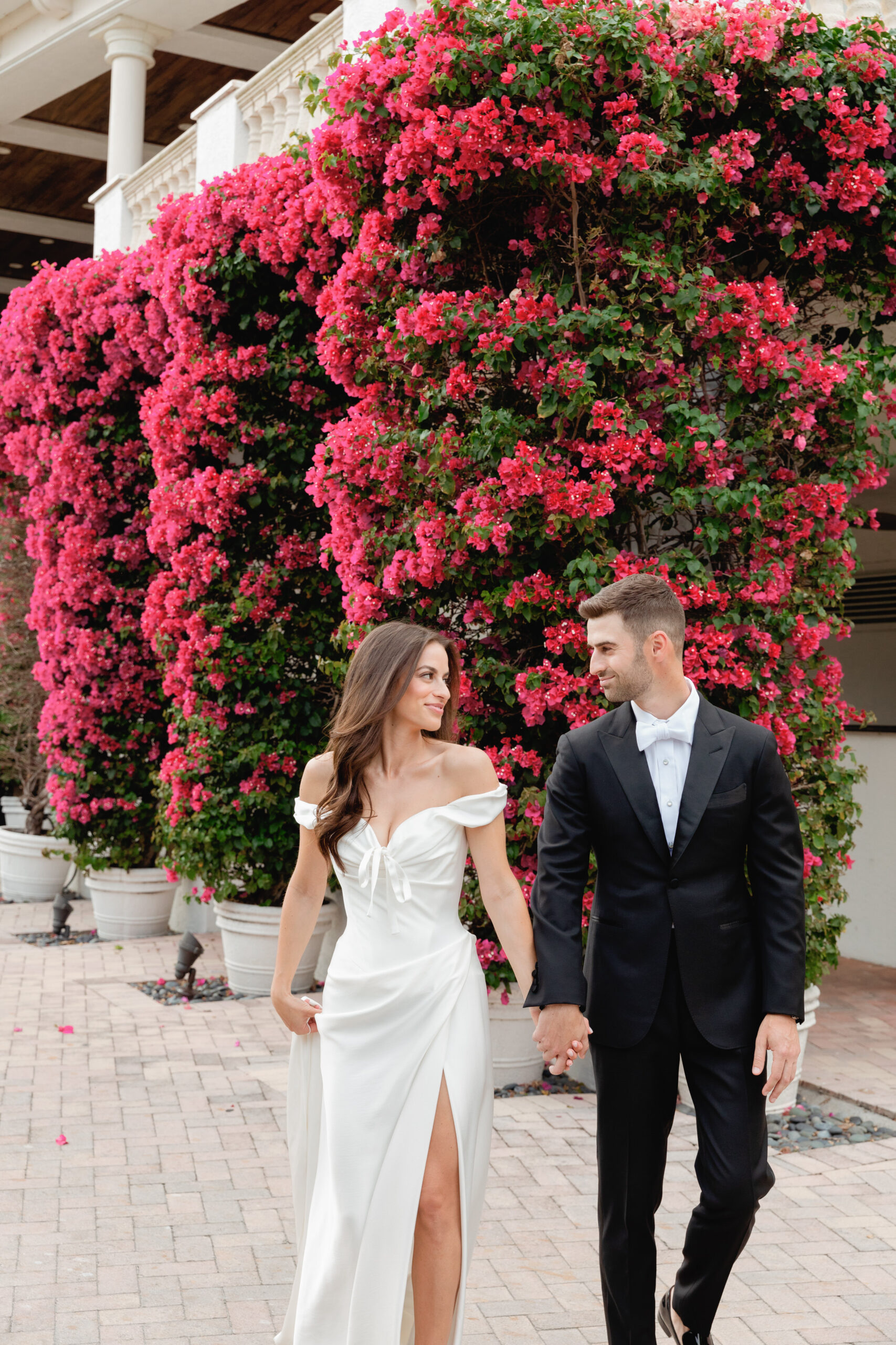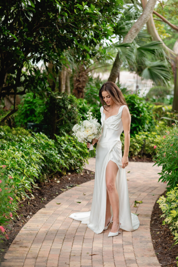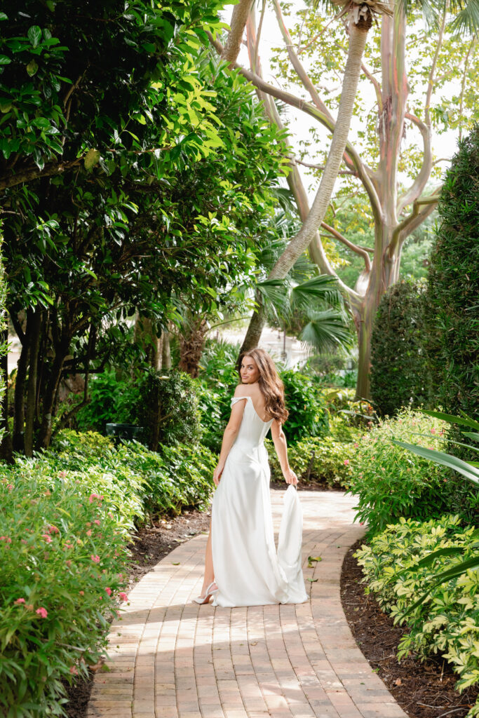 • bride on stairs of the Biltmore Hotel, Miami as her veil blows in the breeze