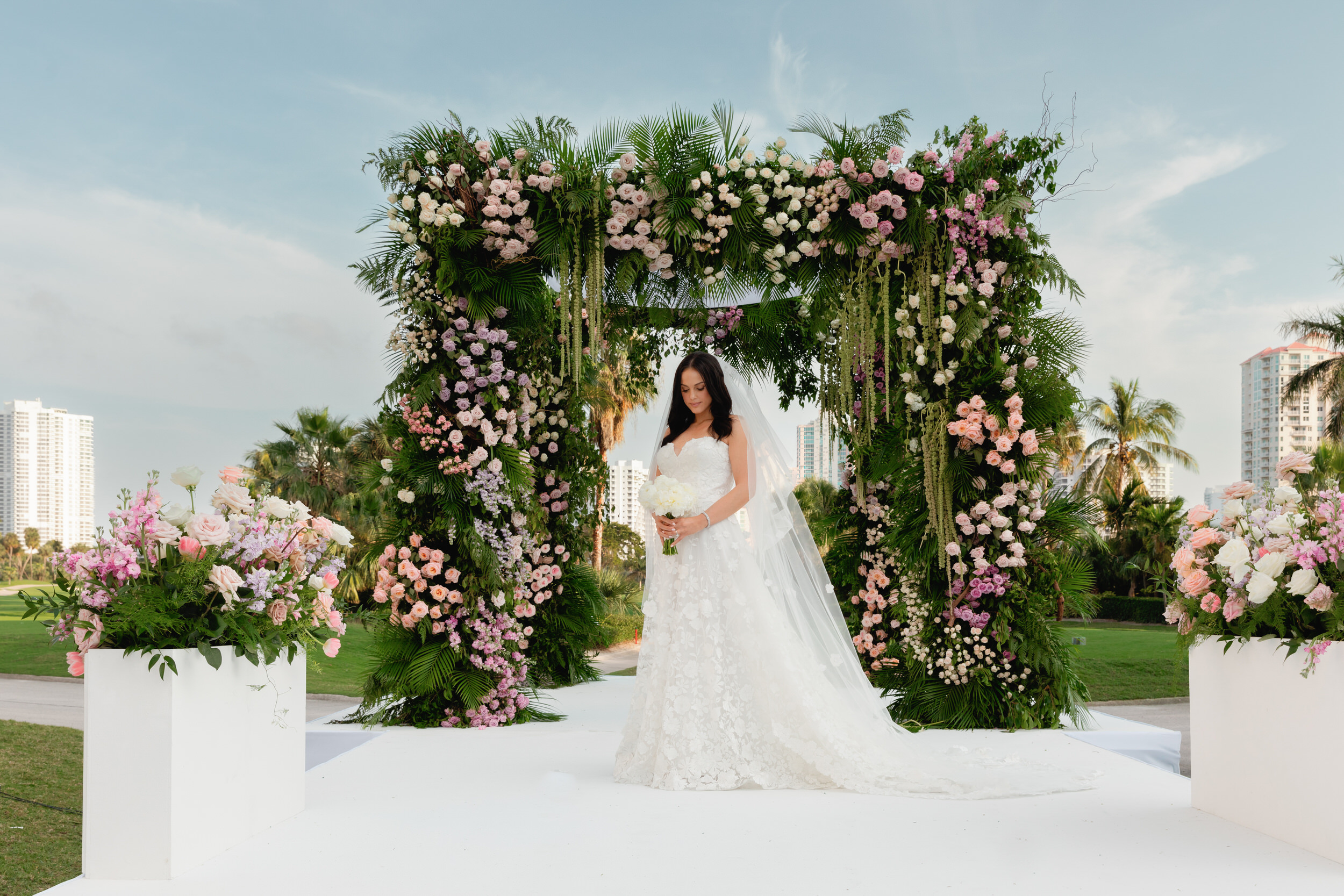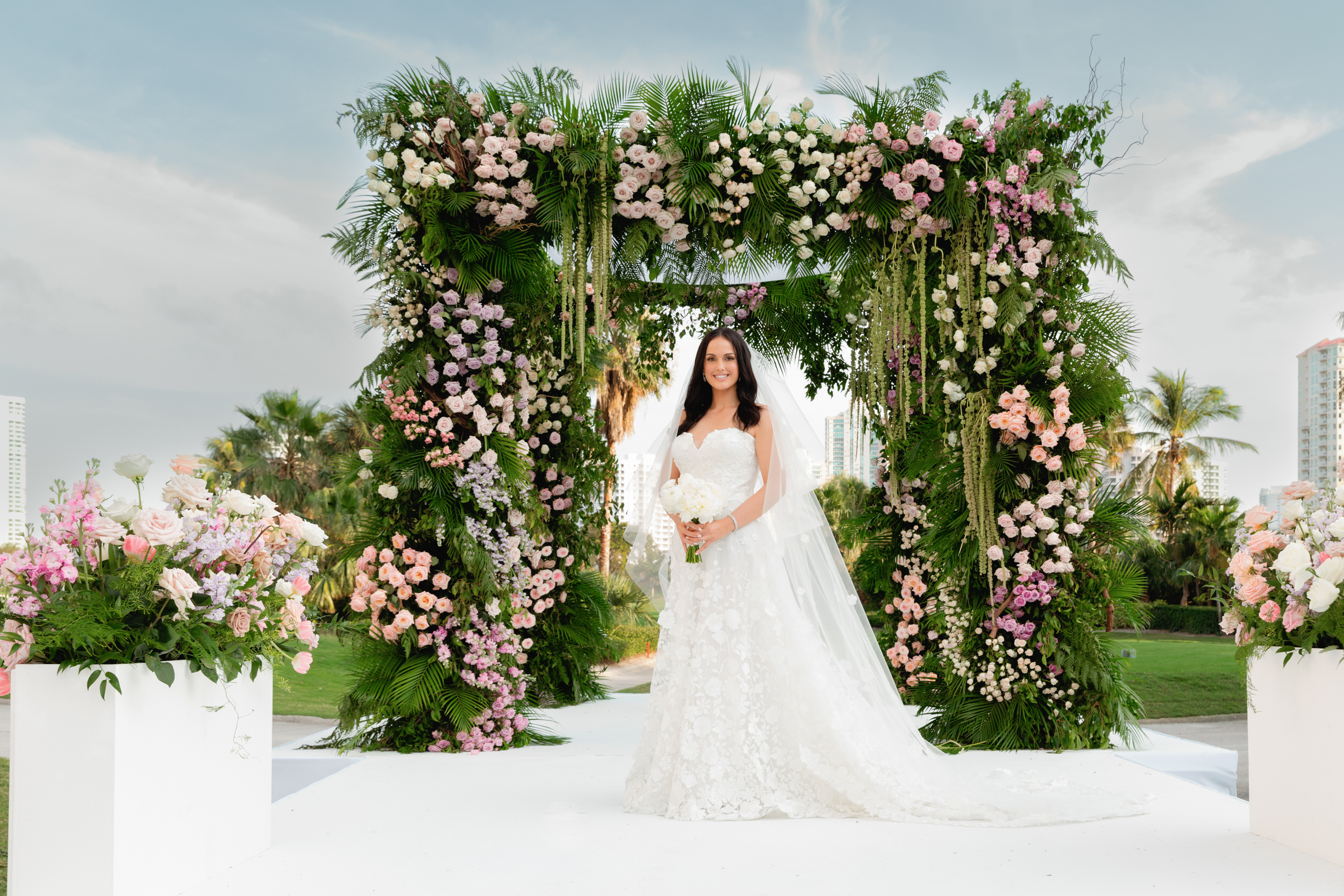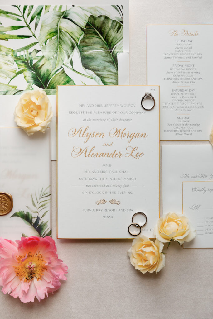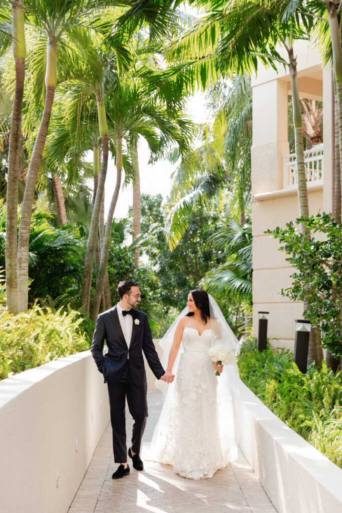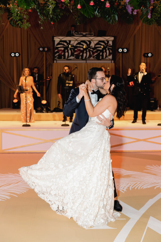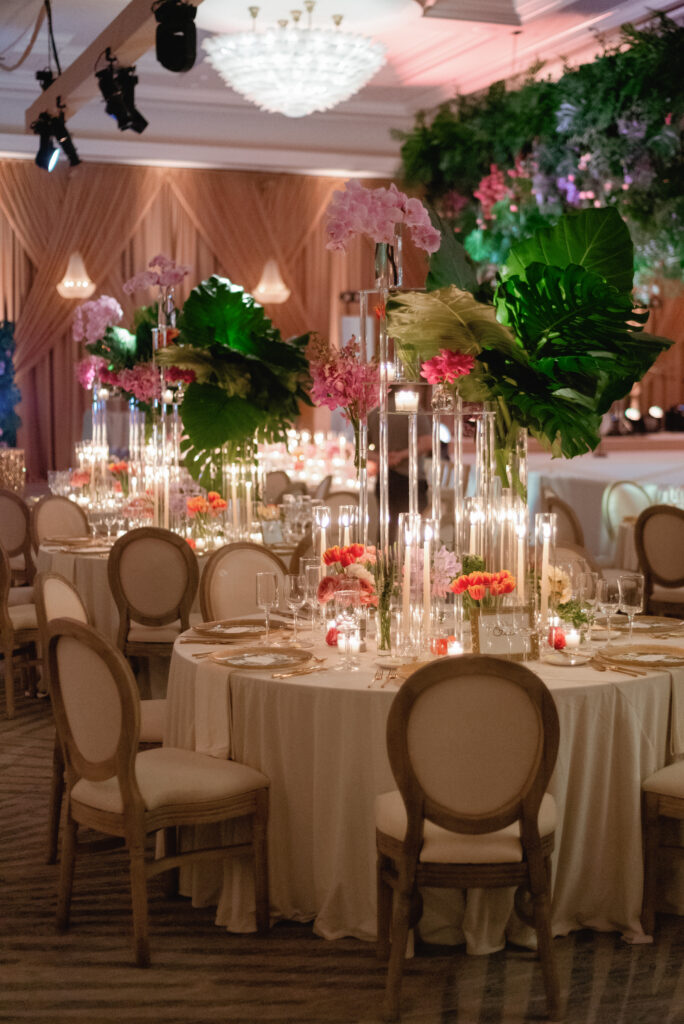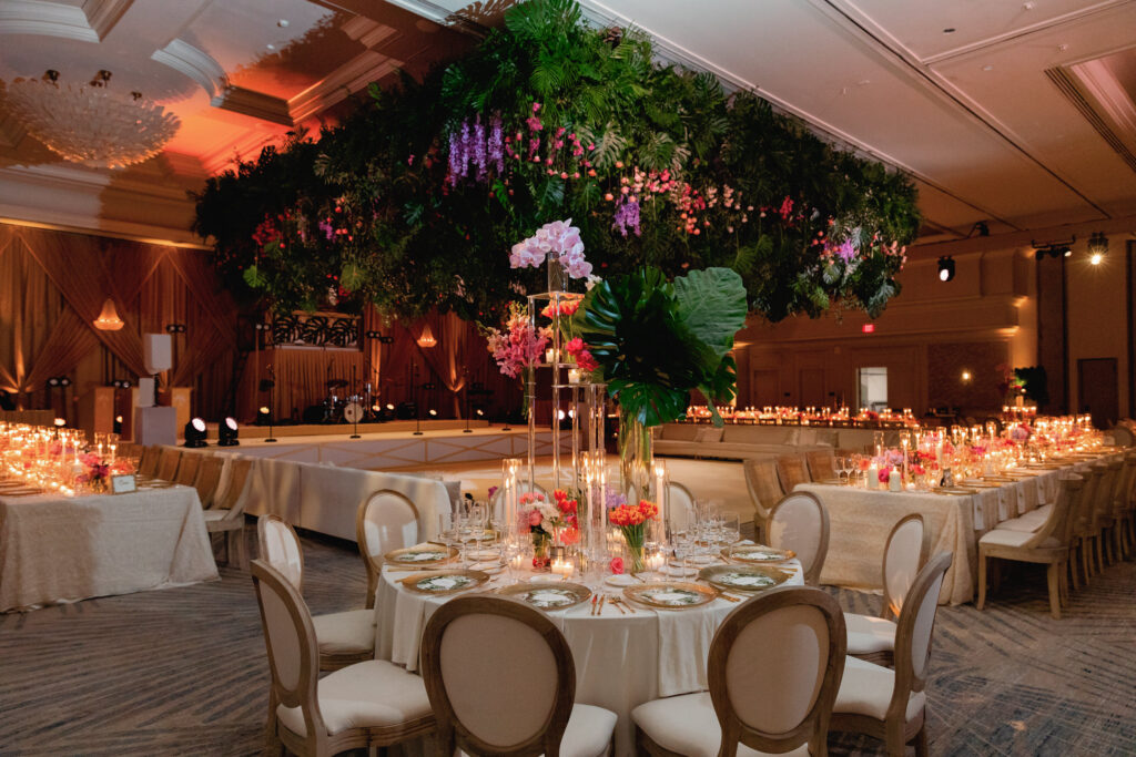 Inside the ballroom, guests were surrounded by a lush, tropical design that felt bold, elegant, and completely unforgettable. Tantawan Bloom outdid themselves all weekend long, from the welcome dinner to the pool party and every detail in between. The day was beautifully planned by Sense Solutions, with the bride wearing a stunning Sareh Nouri gown and flawless hair and makeup by Tashy Marie. Photographed by a JW Turnberry Aventura wedding photographer, this gallery captures dramatic light, incredible design, and the joyful energy that filled every part of Ali and Alex’s celebration.
