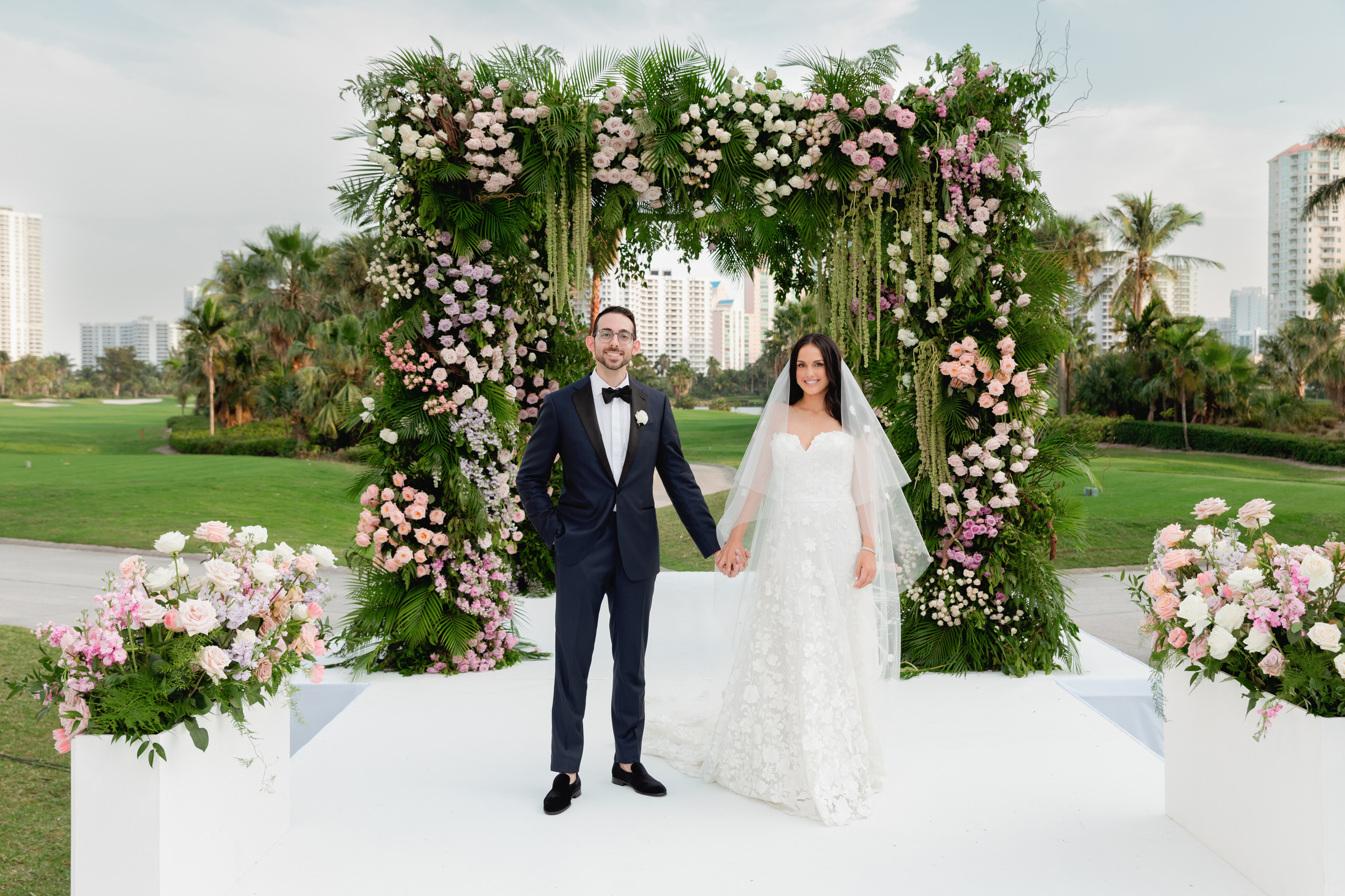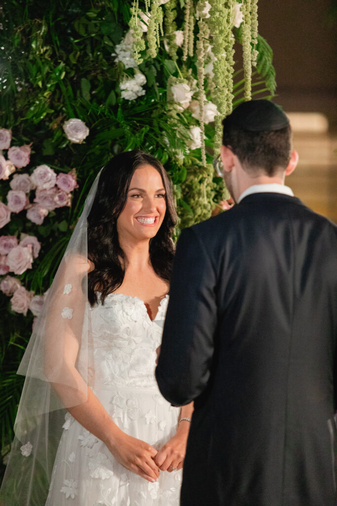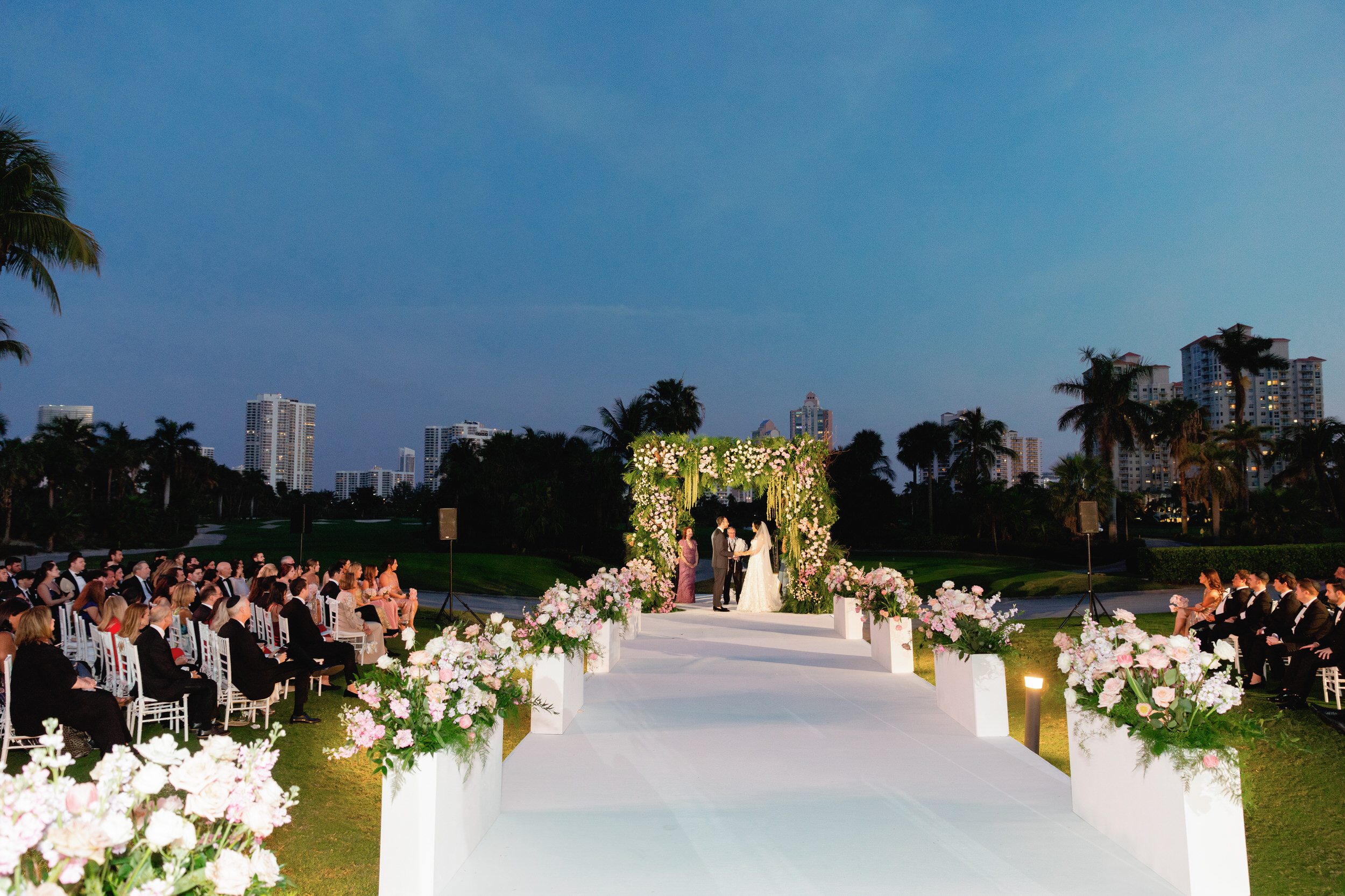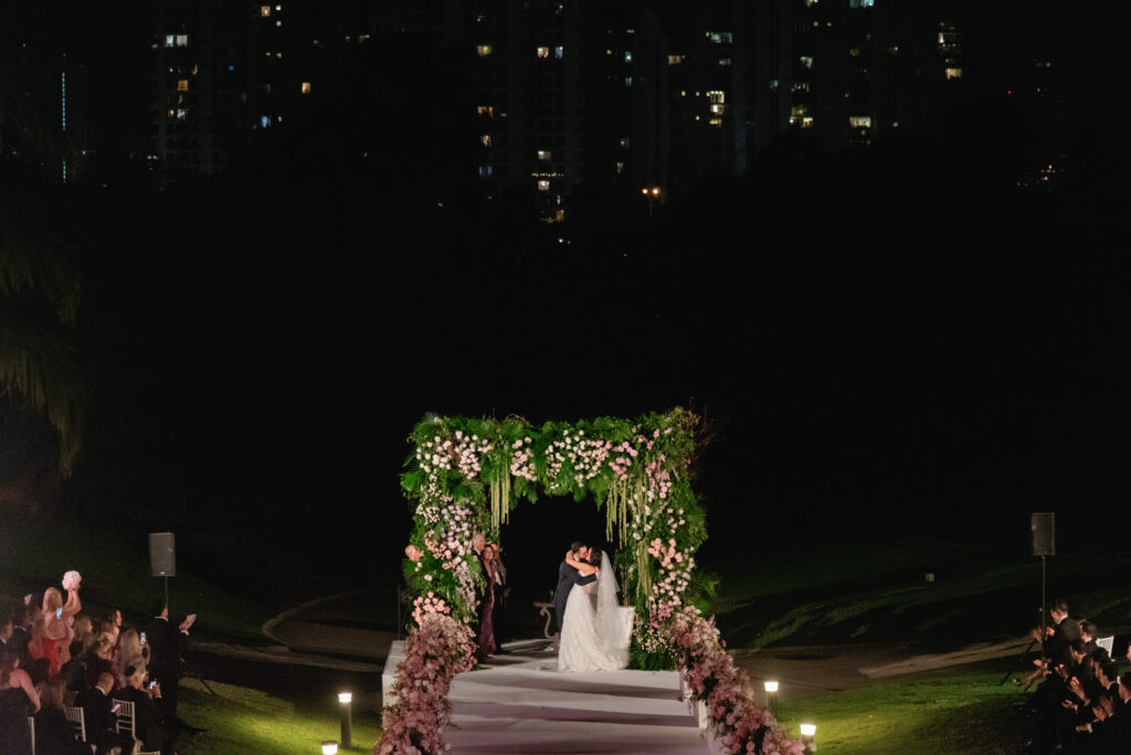 Ali and Alex’s JW Turnberry wedding in Aventura was nothing short of spectacular. Their nighttime ceremony overlooking the golf course featured a dramatic, runway-style aisle leading to an elevated chuppah platform, creating one of the most striking and emotional ceremony settings you could imagine.