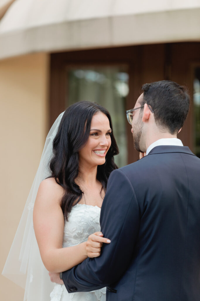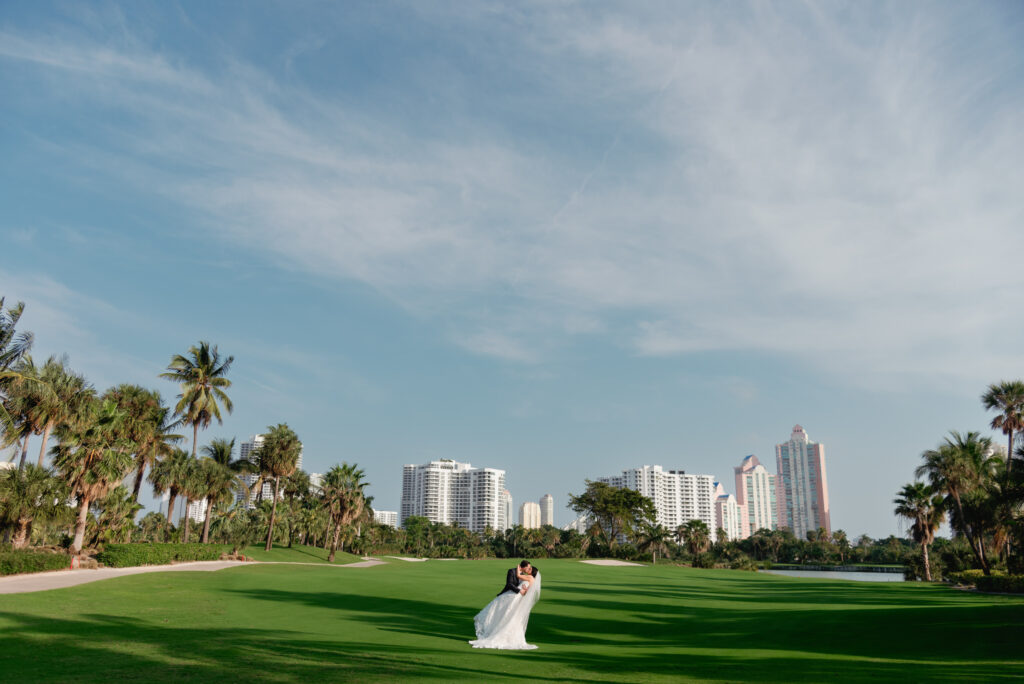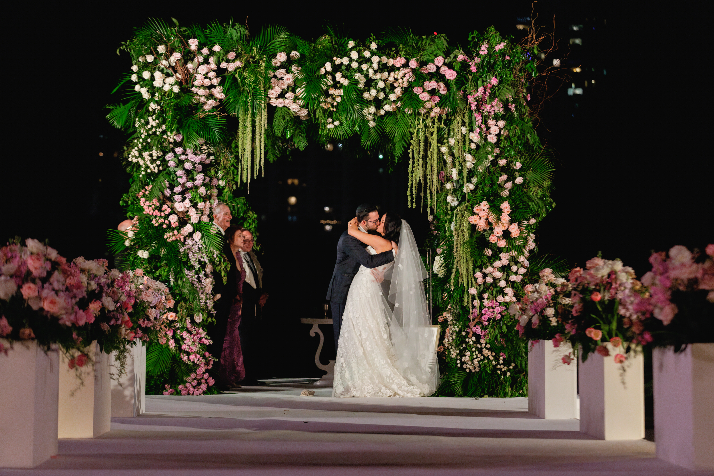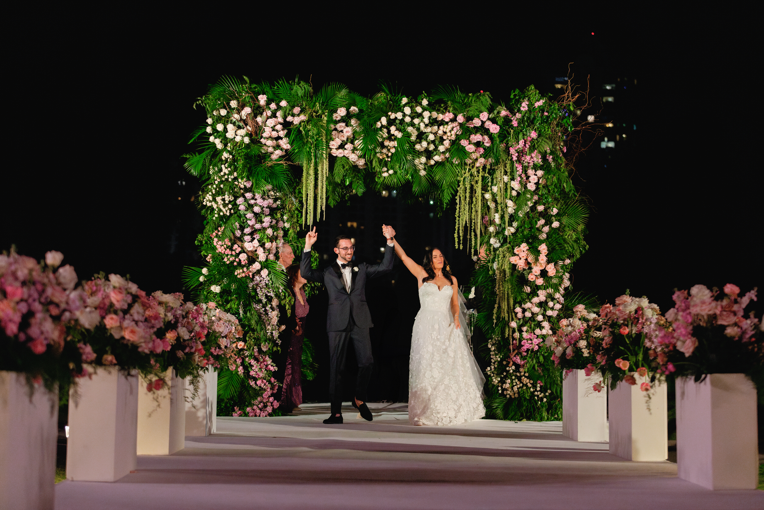 Ali and Alex’s JW Turnberry wedding in Aventura was nothing short of spectacular. Their nighttime ceremony overlooking the golf course featured a dramatic, runway-style aisle leading to an elevated chuppah platform, creating one of the most striking and emotional ceremony settings you could imagine.