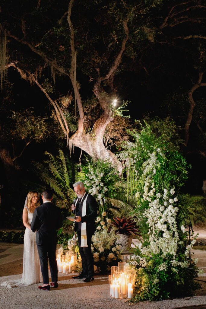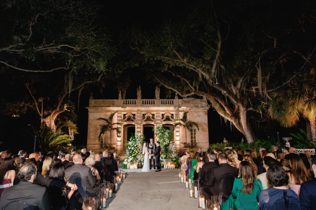 This Vizcaya Museum and Gardens wedding took place just after sunset, creating a romantic and intimate setting for their ceremony. As the evening light faded, candles and soft uplighting filled the gardens, giving the night a warm and elegant glow.