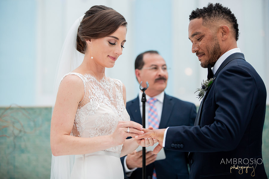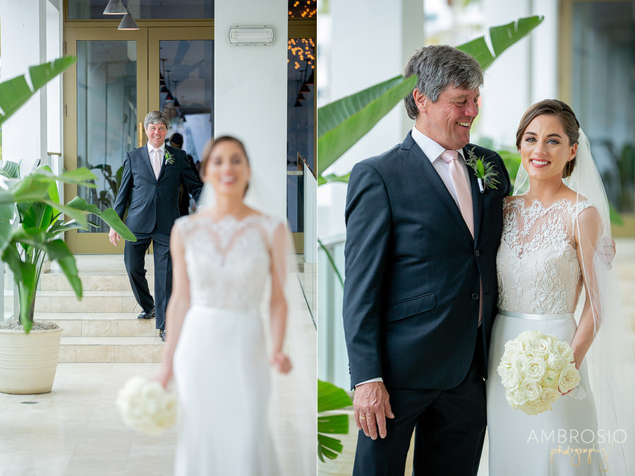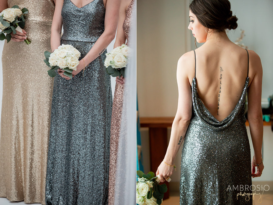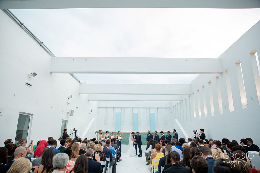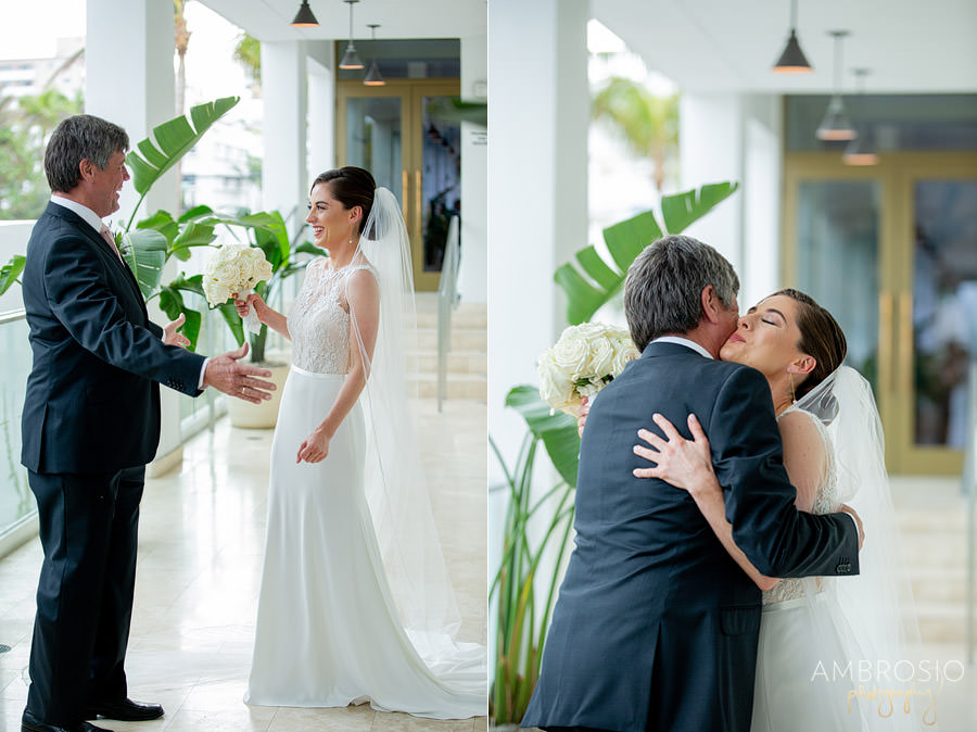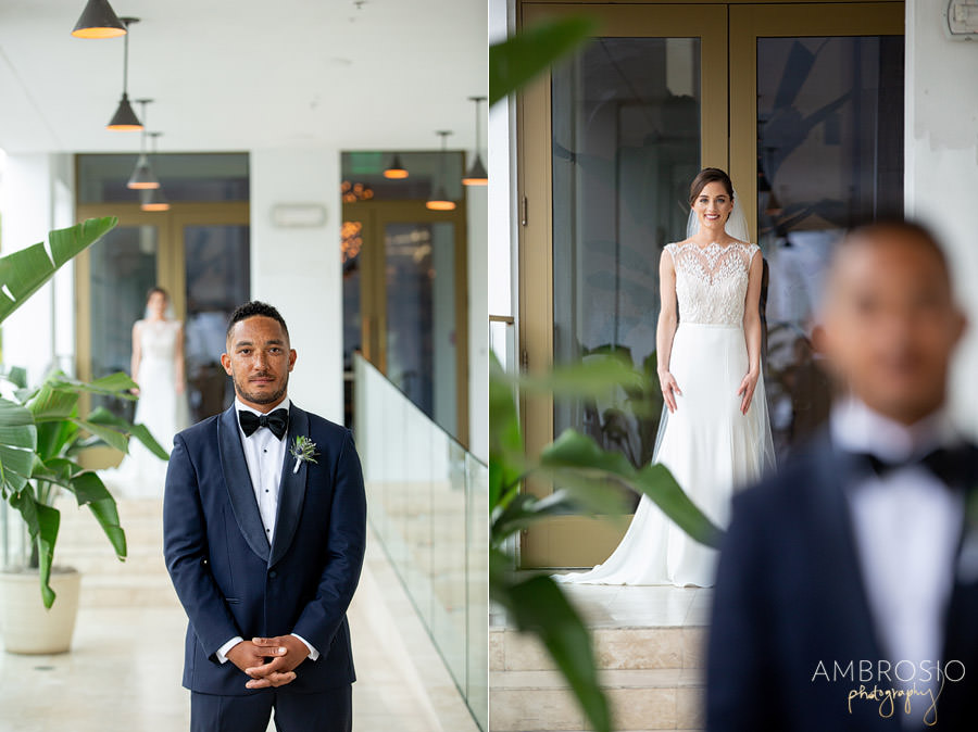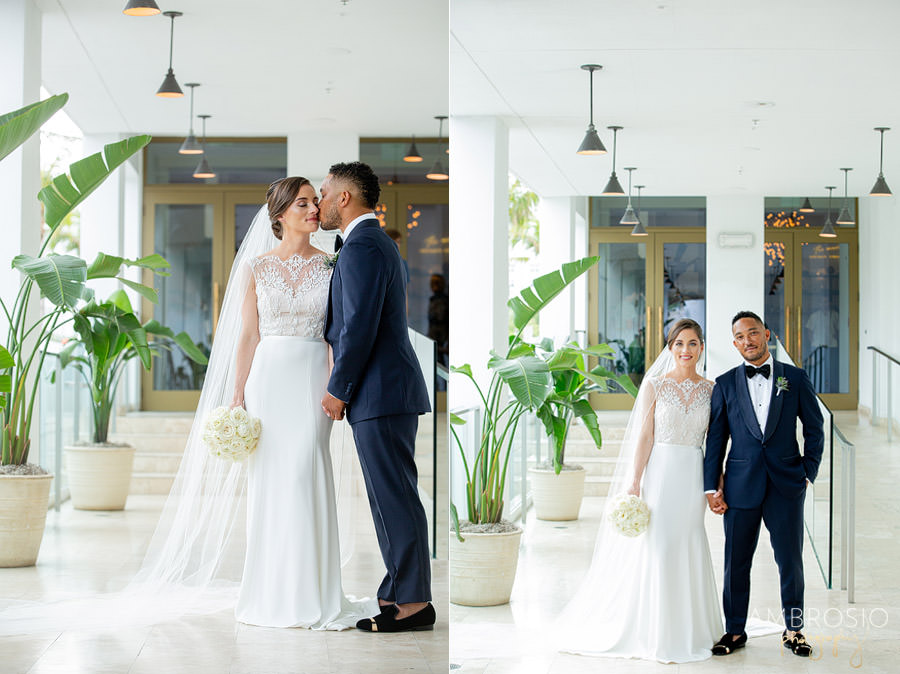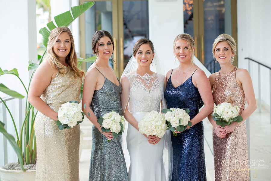Bridget + Joshua’s Miami Beach wedding was held at the Temple House, in the heart of South Beach! They wanted their wedding day to be fun and reflective of their personal style. Their Art Deco-inspired celebration was filled with vintage style and modern aesthetic, creating the perfect blend for their wedding day. When I arrived at the Shelborne for their wedding preparation I was grateful to find a beautiful outdoor location for portraits. The hotel’s style matched the retro feeling of the Temple House. This was the perfect location for their first look & bridal party portraits, and the best back of plan for the inclement weather! The sequined bridesmaid dress’s were the perfect art-deco inspired detail to compliment the vintage lace on Bridget’s wedding gown.